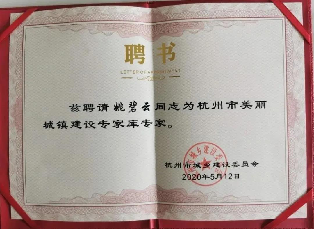 今年5月,企业董事长姚碧云获聘杭州市美丽城镇建设专家库专家,为美丽杭州、美丽浙江建设提供理论支撑、智力支持和技术保障。